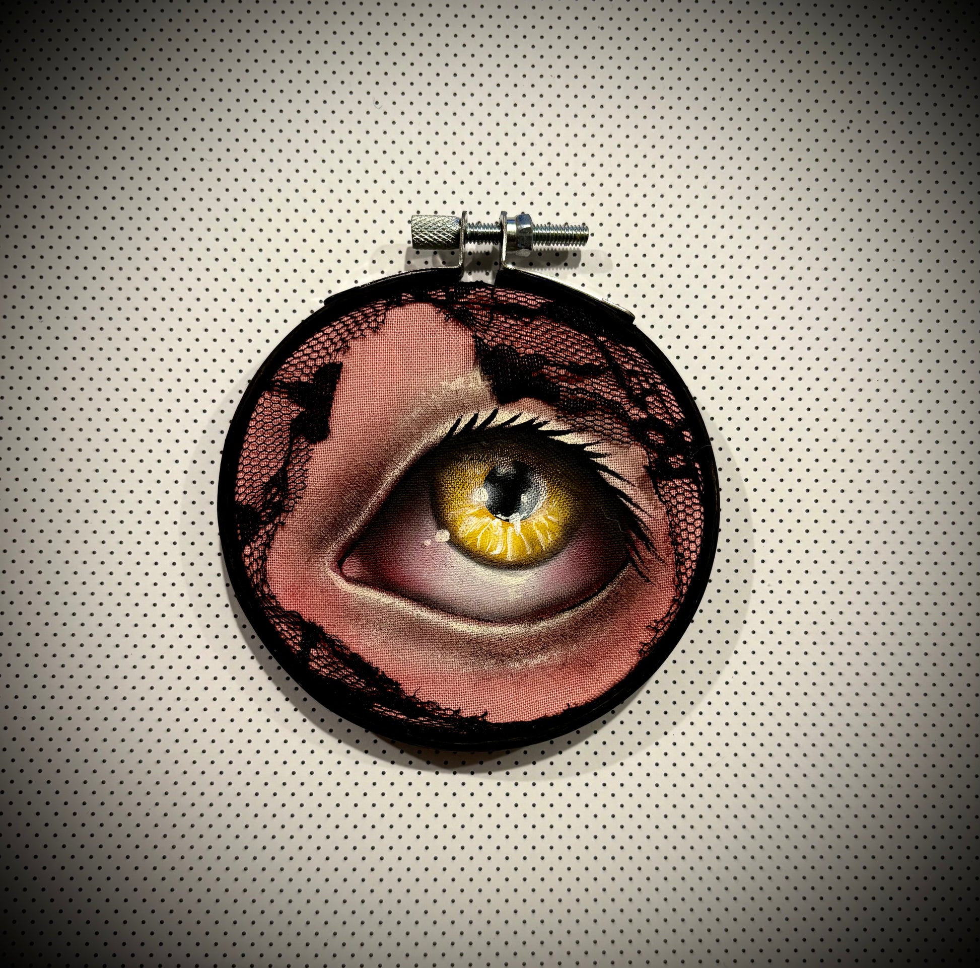 Oil Painting on fabric, Secured on a Tambour frame.